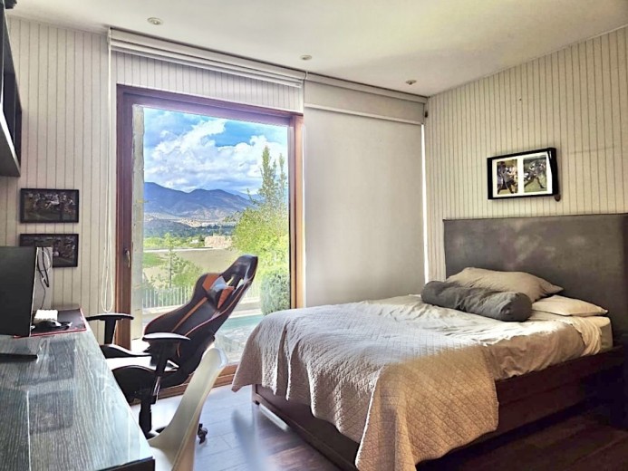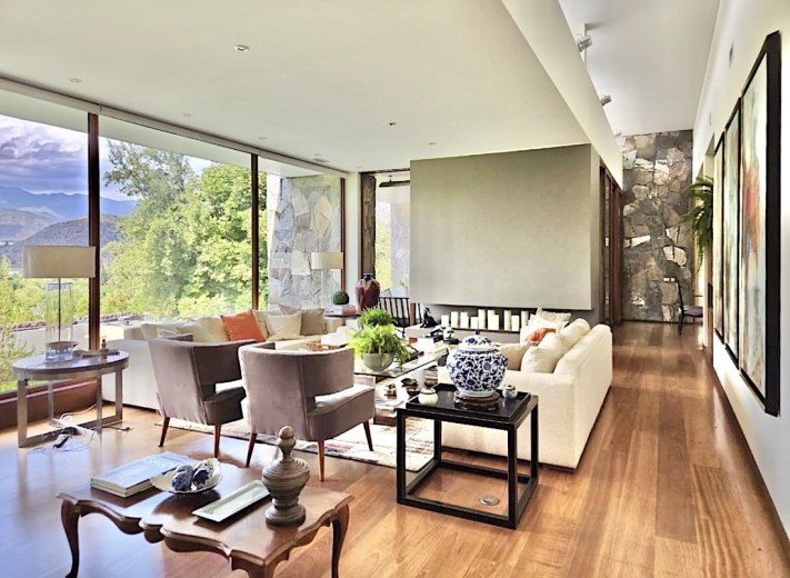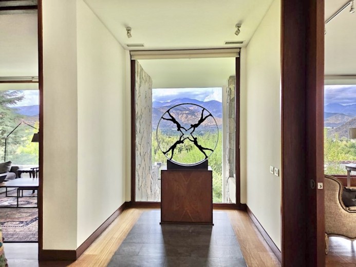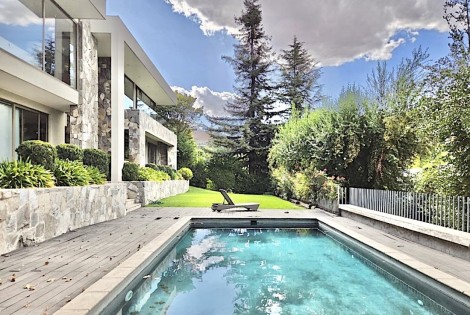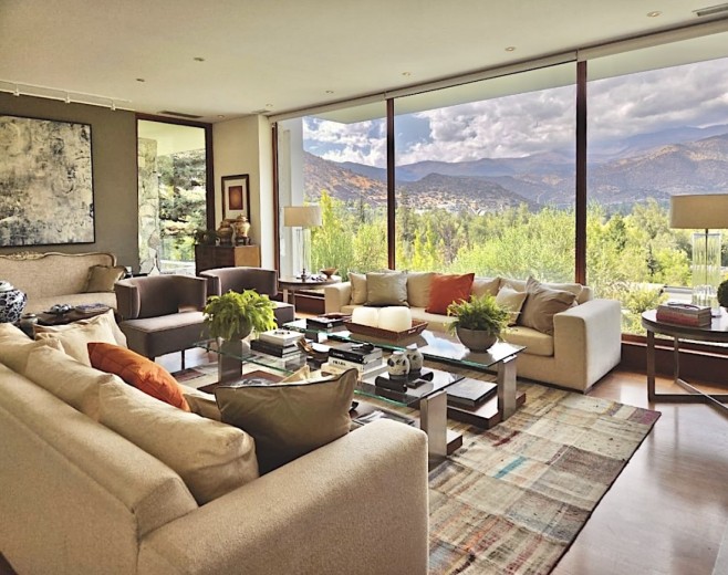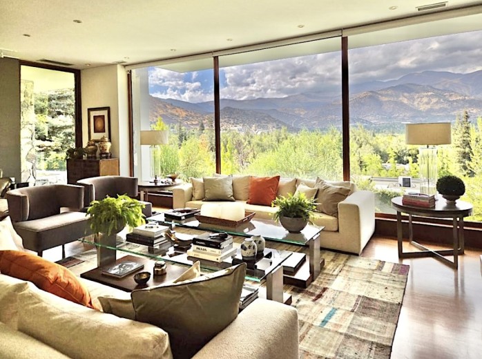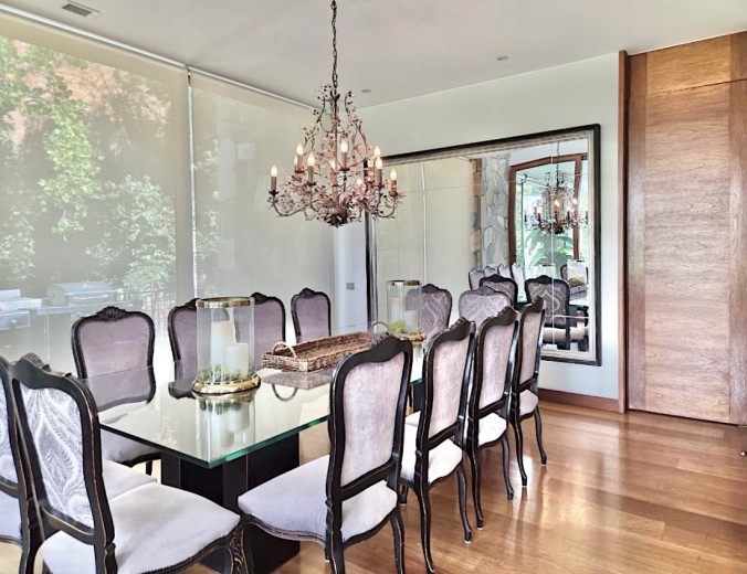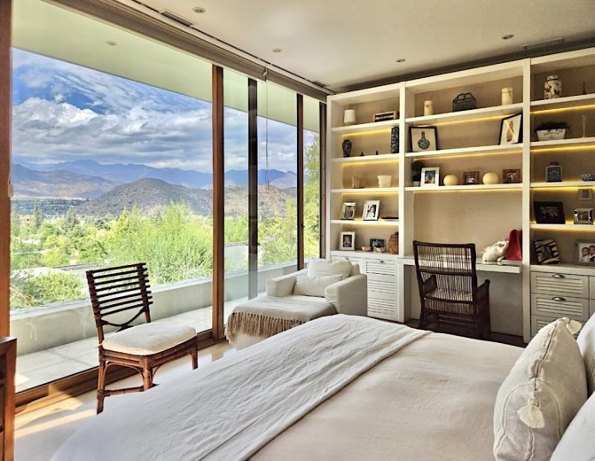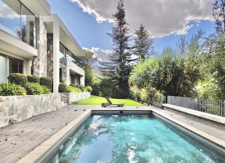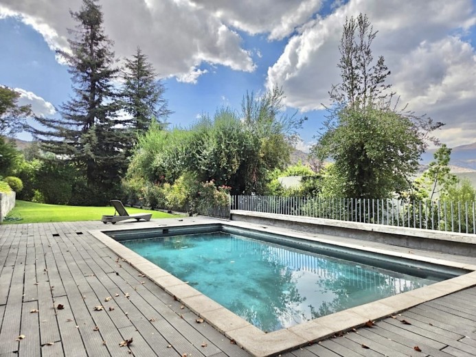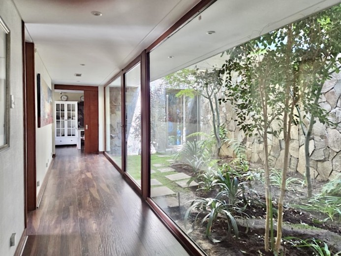 Ubicada en el exclusivo sector Golf de Manquehue, en La Dehesa, esta propiedad se emplaza en un entorno residencial consolidado y muy tranquilo. Cercana a reconocidos colegios como Santiago College, Colegio Huinganal, Mayflower School y Nido de Águilas, además de centros comerciales, servicios y excelente conectividad. Una casa estilo mediterránea, con un espectacular y amplio hall de entrada, living con doble altura y una increíble vista al oriente y comedor con salida a una exquisita terraza también con espectacular vista. Cuenta con cocina, de muy buen tamaño, con un cómodo mesón central, comedor de diario, despensa y una escalera que une al sector donde están los dormitorios de servicio. Desde el hall de entrada también se accede a una sala de estar con espectacular vista al oriente, al baño de visitas y al dormitorio principal, que cuenta con dos amplios walking closet y armarios de pared y un exquisito baño con jacuzzi, ducha y vanitorio doble. En este mismo sector hay una habitación escritorio. Bajando al siguiente nivel, nos encontramos con un hermoso jardín interior, tres amplios dormitorios en suite, uno de los cuales tiene salida al jardín, donde está la piscina. Una amplia sala de estar con un sector de estudio, un baño de visitas, y otra sala de estar de buen tamaño. También hay un amplio gimnasio, con vista al jardín interior. En este piso se encuentran los dos dormitorios de servicio, con baño, un sector de bodega y sala de caldera y electricidad. La casa además tiene un baño de jardinero en el exterior. Todas las ventanas son de termopanel con lámina antirobo, la casa cuenta con un sistema de aspiración centralizado, cámaras de seguridad, rollers automáticos y la caldera funciona a petróleo y parafina. Hermoso piso de madera boliviana. Los ductos de aire acondicionado en obra, listos para instalar.