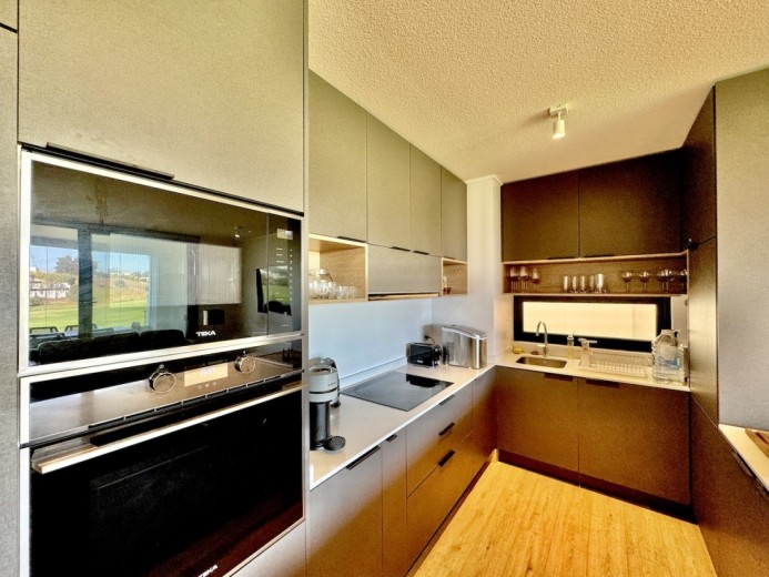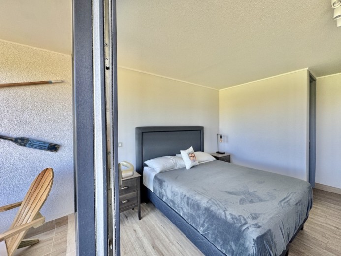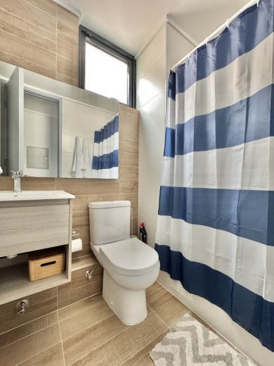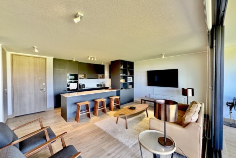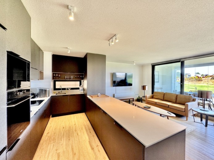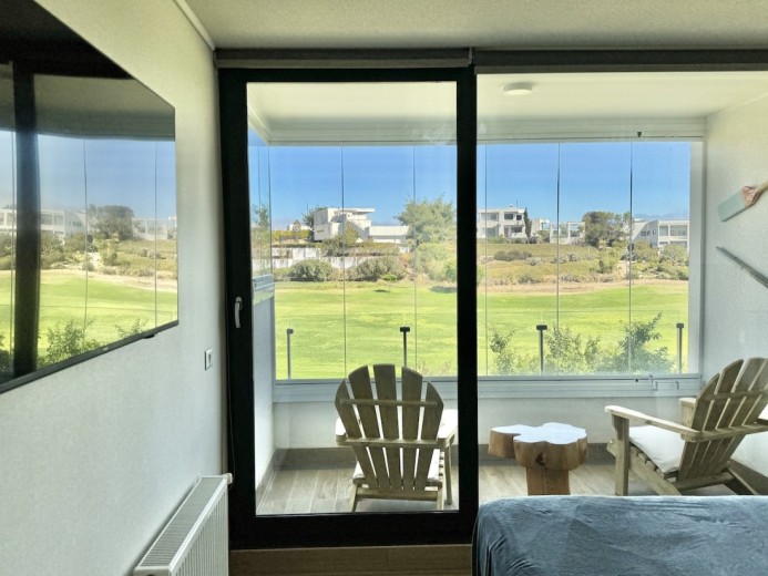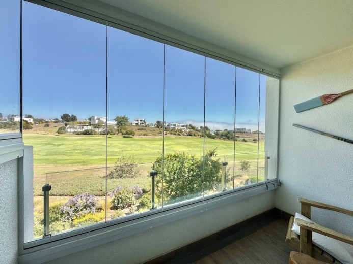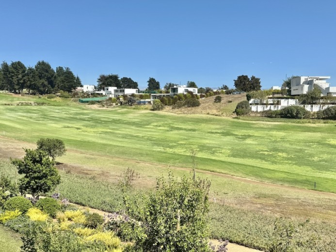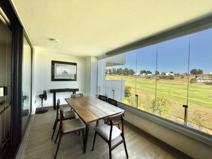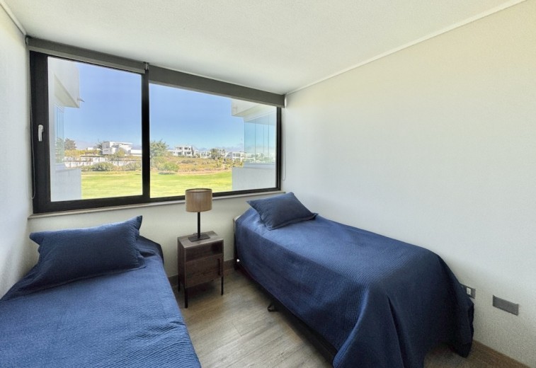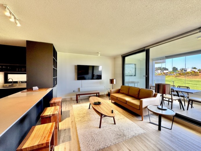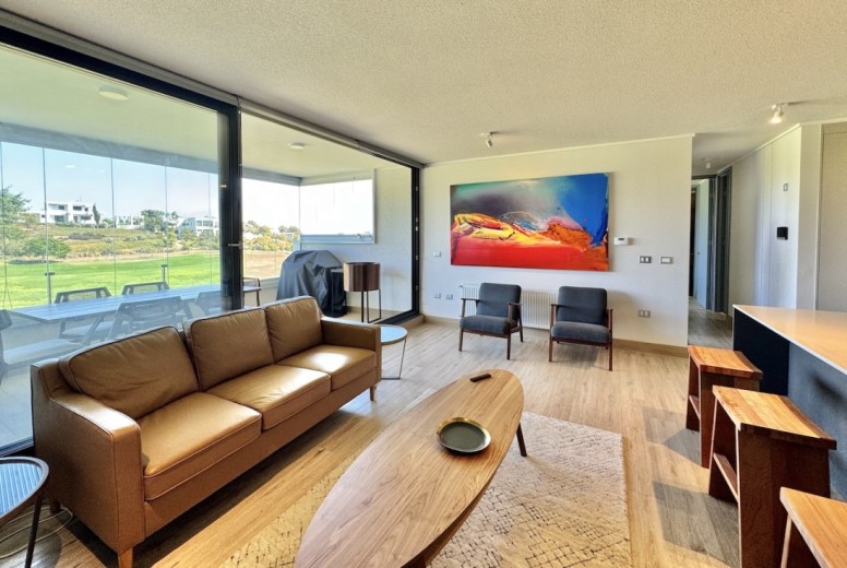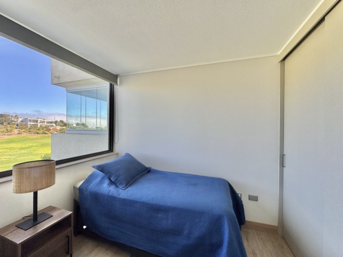 Este acogedor departamento ubicado en el consolidado condominio de Marbella, emplazado en un segundo piso - nivel calle - con acceso directo desde los estacionamientos, sin escaleras, destaca por su entorno residencial de alto estándar y su privilegiada ubicación en primera línea de la cancha de golf. Cuenta con 74 m2 útiles, 21 m2 de terraza con vistas despejadas, dos dormitorios - el principal en suite con terraza privada - y un baño, además de living comedor con excelente conexión a la terraza, orientación poniente, lo que garantiza luminosidad natural y agradables atardeceres. El departamento incluye un estacionamiento descubierto, una bodega, calefacción por radiadores, piso vinílico, ventanas termopanel, baños con piso de porcelanato, muebles de cocina marca Todeschini con cubierta de cuarzo, encimera, horno, y alarma en puerta de acceso. Marbella cuenta con control de acceso las 24 horas, cámaras y rondas de seguridad, club house con grandes salones de estar, exquisito restaurante, cafetería, piscinas, gimnasio, sauna, canchas de golf, tenis y fútbol, además de minimarket, iglesia, hotel, y grandes áreas verdes para caminar.