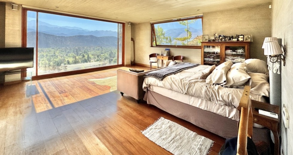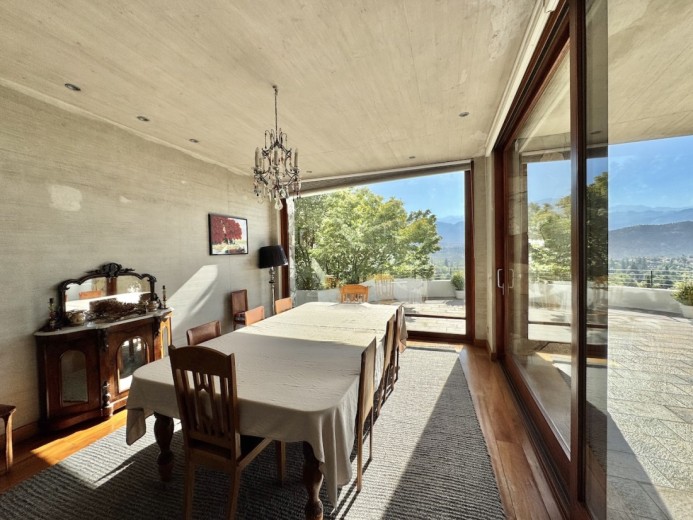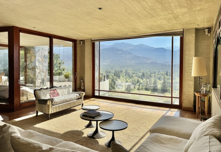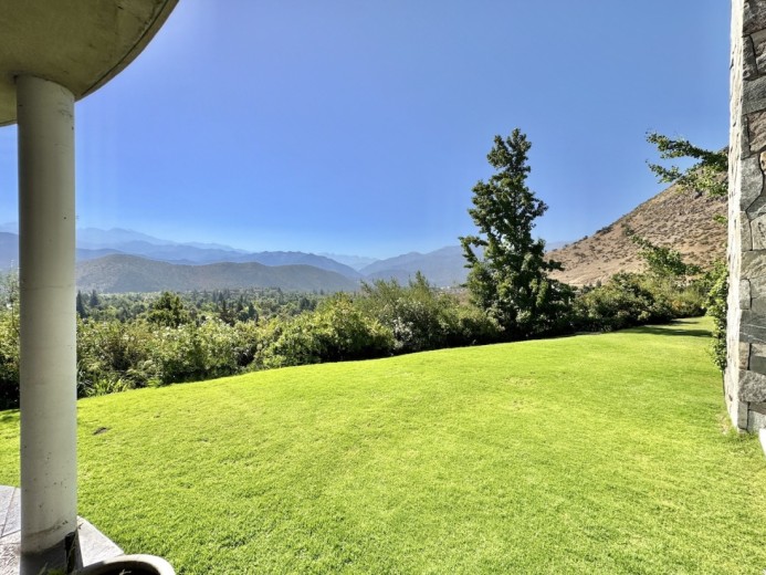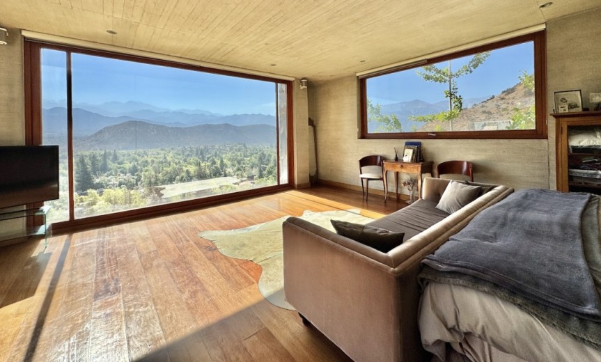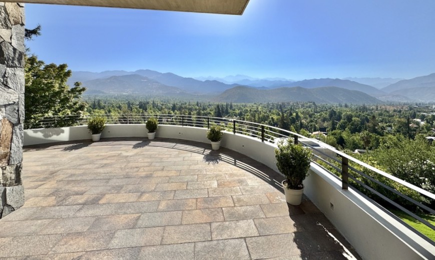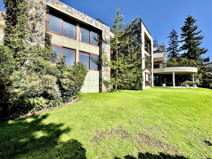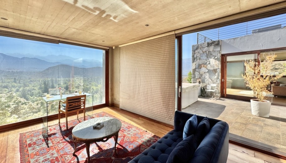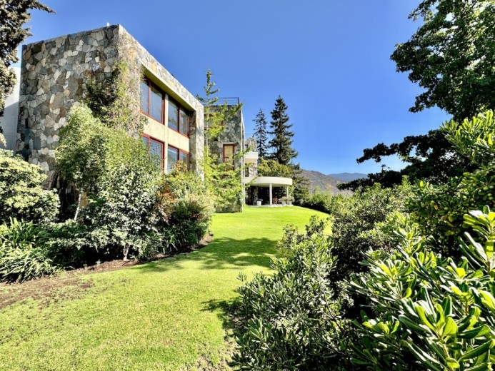 Sin un ápice de duda, las vistas de esta increíble casa son espectaculares, amplias y desbordantes de naturaleza, condecoradas por la sólida materialidad y por los grandes espacios interiores, con paredes altas y columnas tanto internas como externas, con muros de hormigón a la vista y madera. Con grandes e imponentes ventanales, esta gran casa cuenta con un rico hall con doble altura y vista, amplio y precioso baño de visitas, salón y comedor separados con vistas y acceso a una amplia terraza techada y descubierta, rica cocina con comedor de diario, lavadero interior y dos dormitorios de servicio, todo en la planta de acceso y con orientación nororiente en todos sus espacios y niveles. En el piso medio e inferior, hay dos amplios dormitorios con vista por nivel, que comparten dos cómodos baños, además de la enorme y exquisita suite principal con impresionantes vistas, gran walk in closet, terraza propia con jacuzzi y gran escritorio aparte, todo, en lo mas alto de la casa. En el nivel inferior nos encontramos con el jardín maduro con vistas despampanantes, piscina, terrazas, quincho techado con baño y sala de estar. Tiene bodegas, baño jardinero, cerco eléctrico, alarma y circuito cerrado de televisión, además de un amplio estacionamiento.