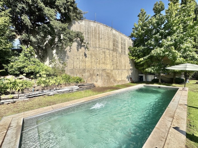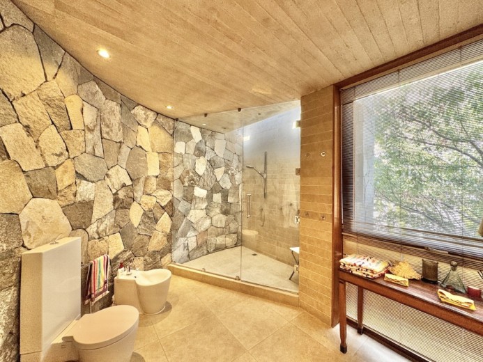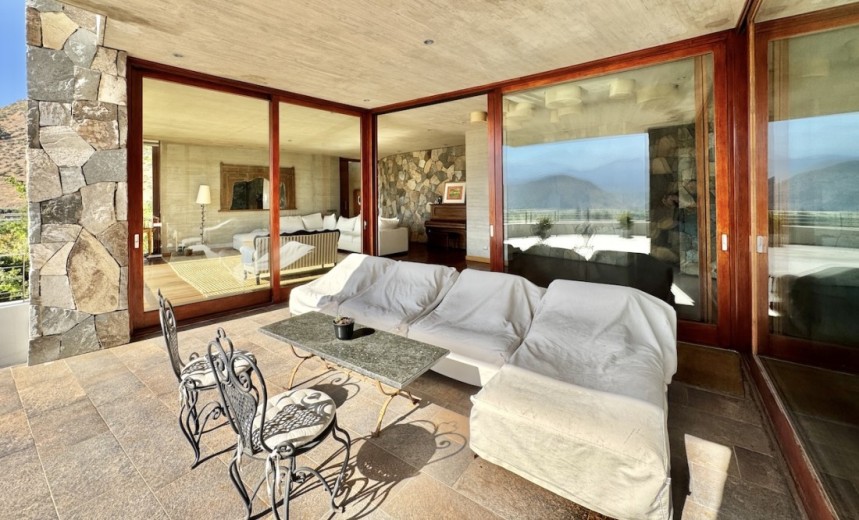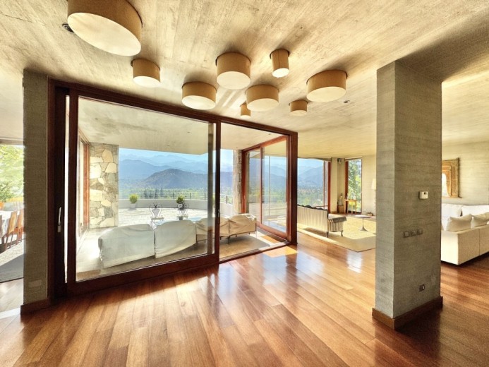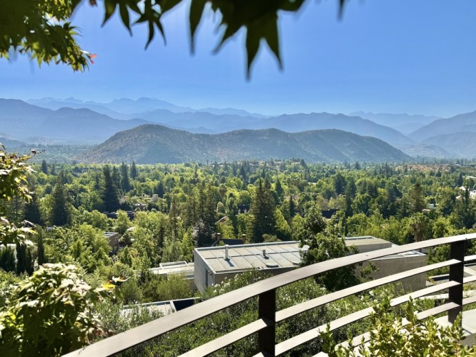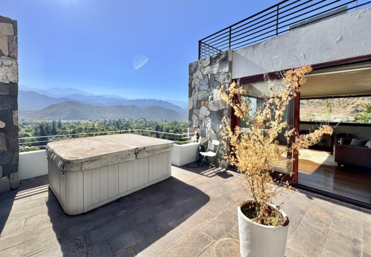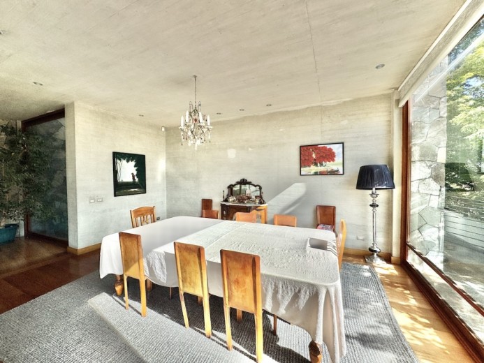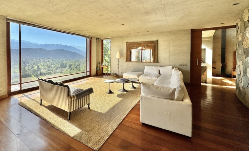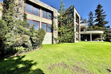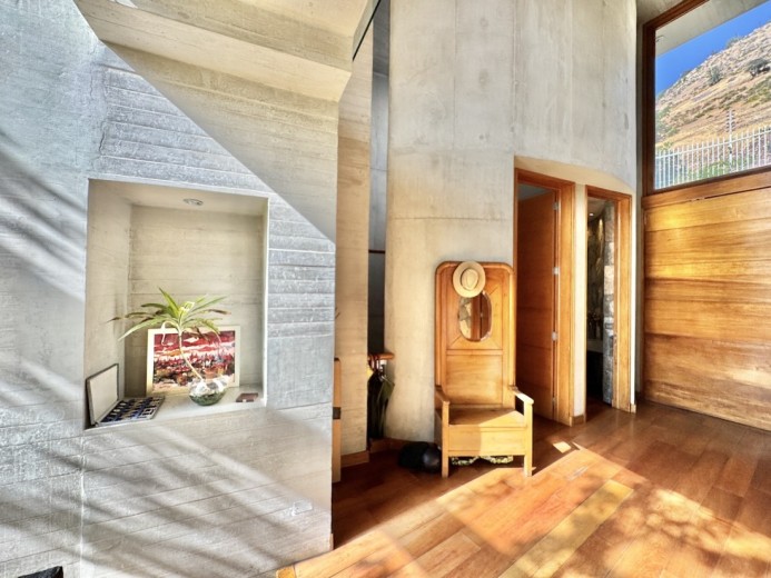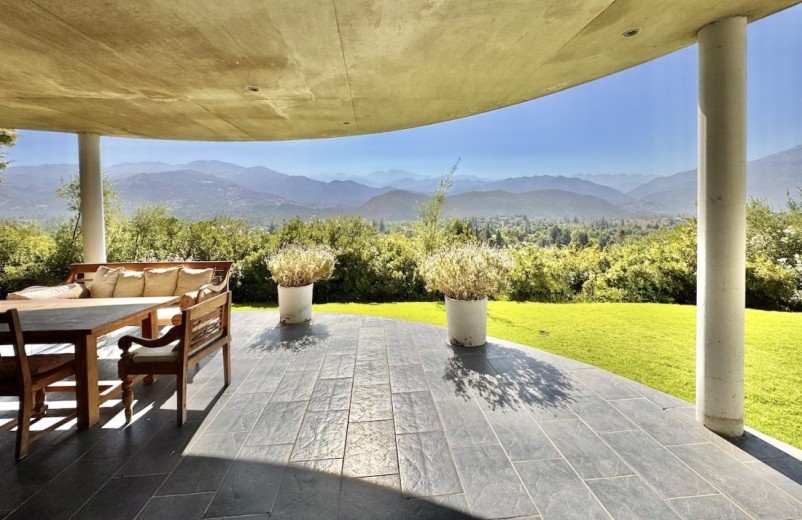 Sin un ápice de duda, las vistas de esta increíble casa son espectaculares, amplias y desbordantes de naturaleza, condecoradas por la sólida materialidad y por los grandes espacios interiores, con paredes altas y columnas tanto internas como externas, con muros de hormigón a la vista y madera. Con grandes e imponentes ventanales, esta gran casa cuenta con un rico hall con doble altura y vista, amplio y precioso baño de visitas, salón y comedor separados con vistas y acceso a una amplia terraza techada y descubierta, rica cocina con comedor de diario, lavadero interior y dos dormitorios de servicio, todo en la planta de acceso y con orientación nororiente en todos sus espacios y niveles. En el piso medio e inferior, hay dos amplios dormitorios con vista por nivel, que comparten dos cómodos baños, además de la enorme y exquisita suite principal con impresionantes vistas, gran walk in closet, terraza propia con jacuzzi y gran escritorio aparte, todo, en lo mas alto de la casa. En el nivel inferior nos encontramos con el jardín maduro con vistas despampanantes, piscina, terrazas, quincho techado con baño y sala de estar. Tiene bodegas, baño jardinero, cerco eléctrico, alarma y circuito cerrado de televisión, además de un amplio estacionamiento.