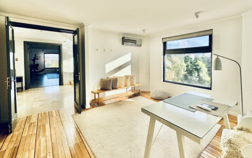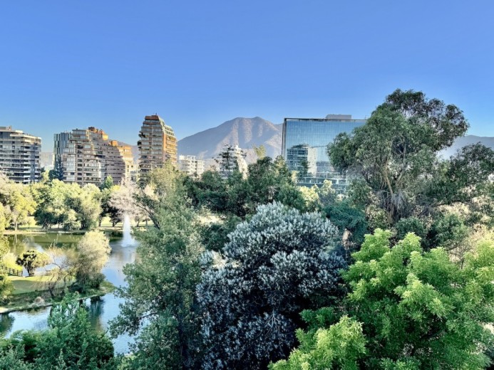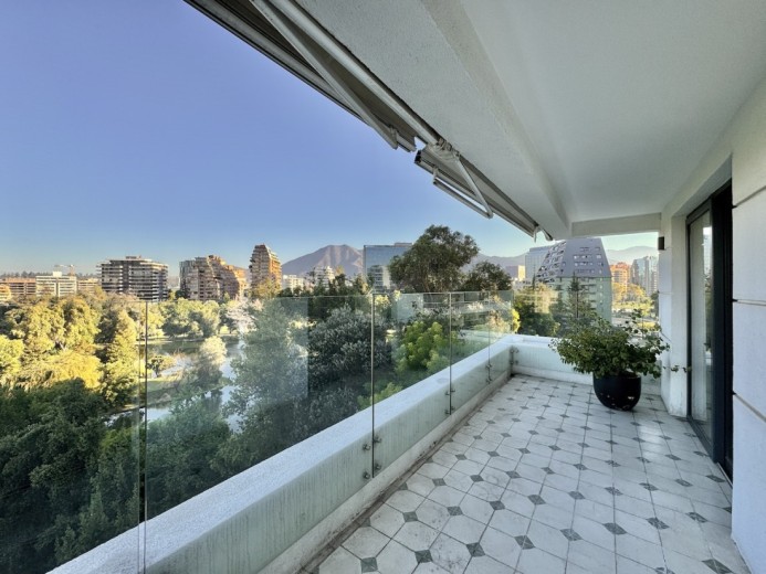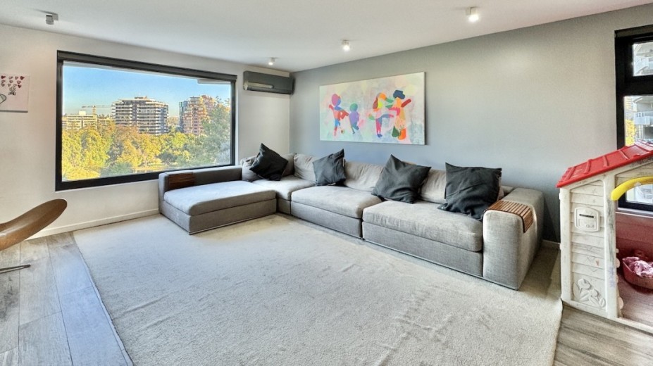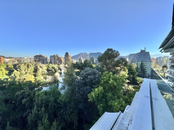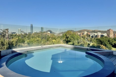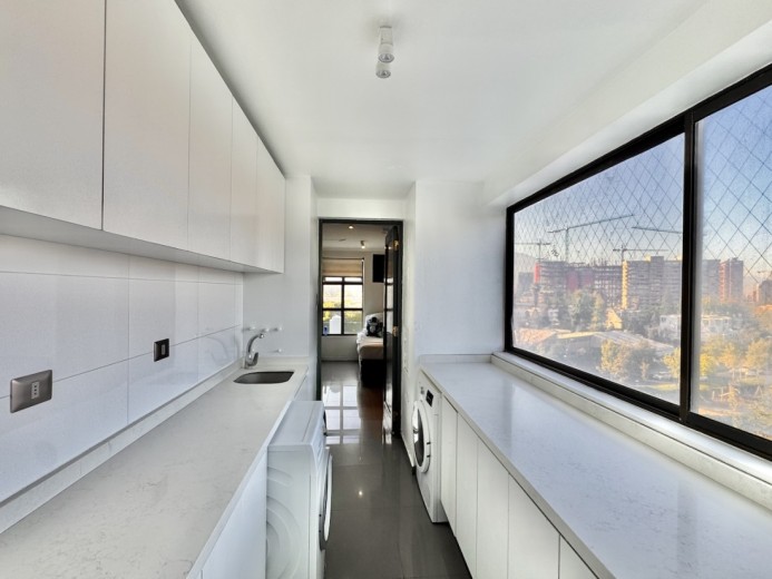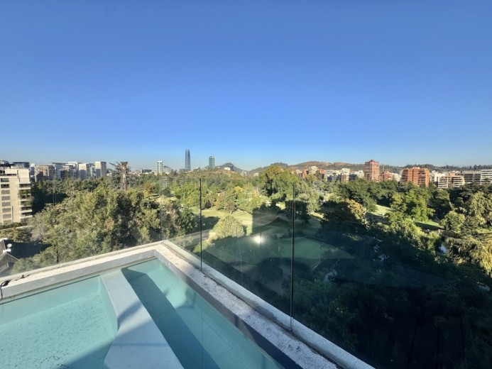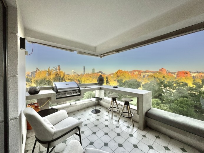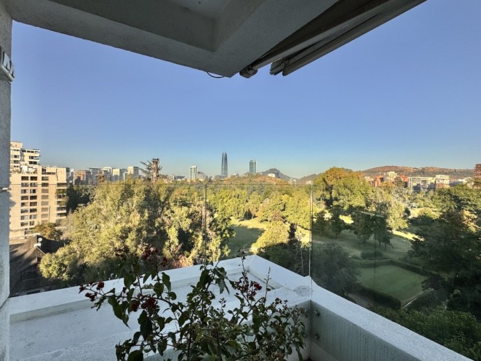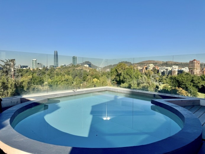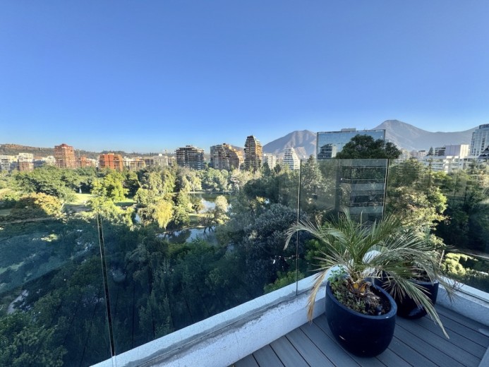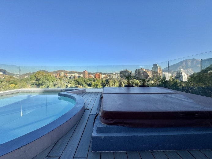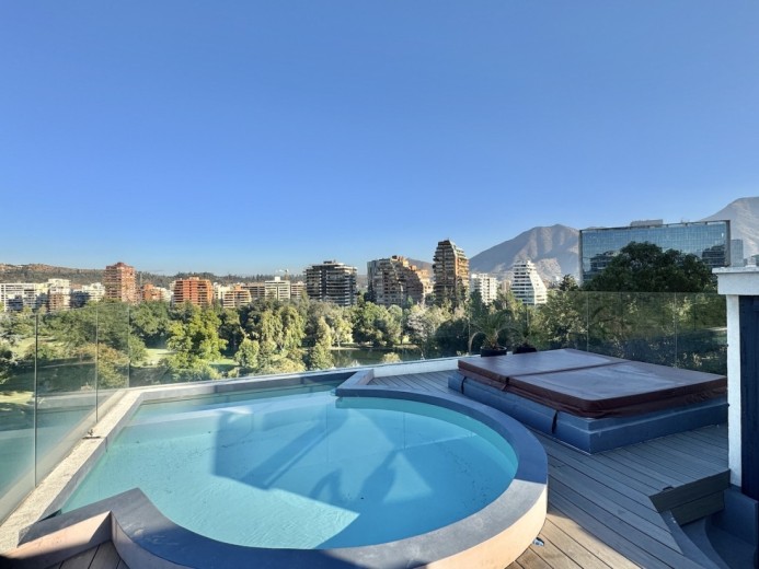 Este fabuloso y único penthouse - remodelado - impecable, luminoso y estiloso, con una ubicación privilegiada (a pasos del mall Parque Arauco, del pulmón vende Parque Araucano, de la exclusiva calle Alonso de Córdova y todo lo que esta particular calle congrega: tiendas, cafés, restaurantes y todo tipo de comercios, y con unas impresionantes vistas al club de golf Los Leones, además de vistas hacia la cordillera de Los Andes, y el cerro Manquehue), cuenta con orientación en todos los sentidos (NOSP); dos ascensores: servicios y particular; amplio y elegante hall con piso de mármol; estupendo y espacioso living comedor semi integrados, con salida a una rica terraza techada con magnifico quincho en obra y vistas panorámicas y espectaculares al club de golf; gran y luminosa cocina con comedor de diario, cubiertas en cuarzo, encimera de vitrocerámica (eléctrica), campana y hornos empotrados Bosch, área despensa y guardado, con gran logia, dormitorio y baño de servicio, además de una rica sala de estar y/o escritorio, un amplio dormitorio (o sala de juegos) con walk in closet y un baño completo, todo en el piso de acceso. El segundo piso cuenta con un enorme y estupendo dormitorio principal con estar y en suite, con acceso a una amplia terraza con maravillosas vistas al club de golf, con walk in closet con tocador y baño con vanitorio doble y shower door; con un dormitorio muy luminoso, con amplio walk in closet, gran baño y con una cómoda sala de estar. En la azotea, en el rooftop, hay un gran espacio cerrado que puede ser un dormitorio de visitas, oficina o gimnasio; y cuenta ademas con un deck con piscina, jacuzzi y mesón en obra para barbecue con vista 360° de la ciudad de Santiago. Tiene dos estacionamientos y bodega, y los pisos del departamento son en mármol, madera y porcelanato; ventanales termo panel, barandas exteriores en cristal templado; calefacción por losa radiante; equipos de aire acondicionado en todos los dormitorios y salas de estar y toldos eléctricos en terrazas.