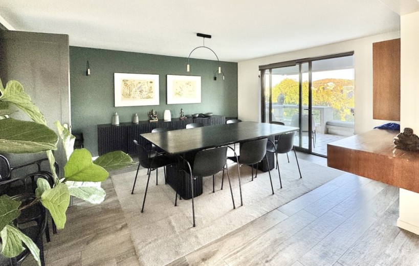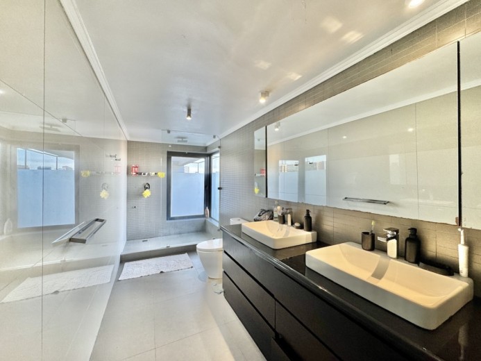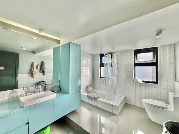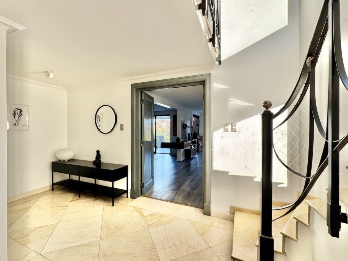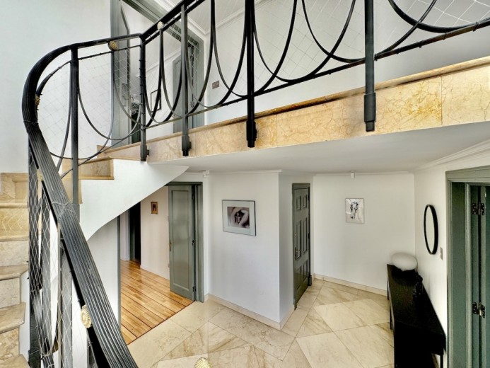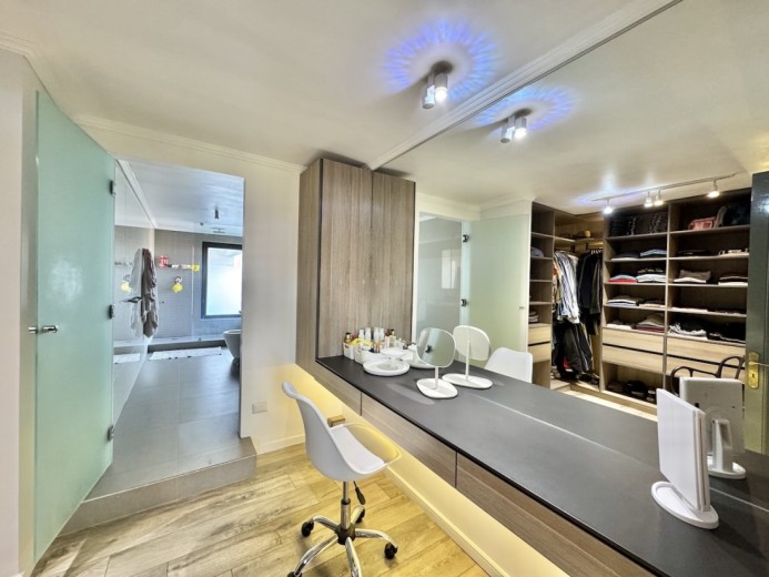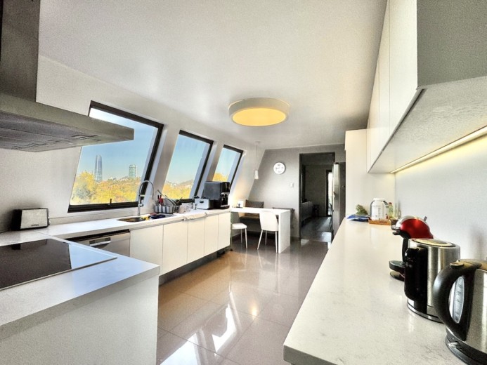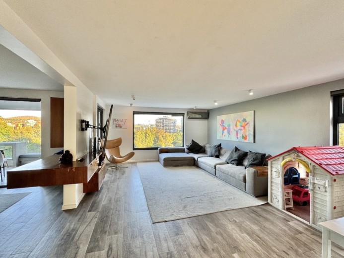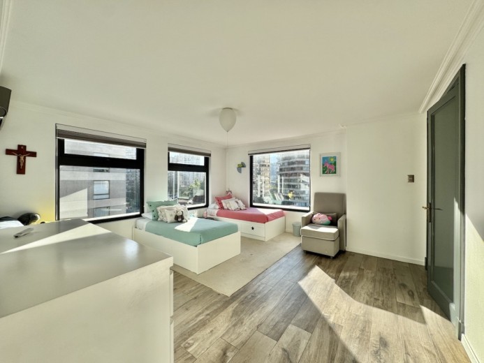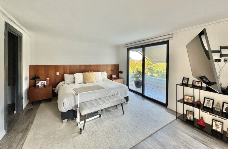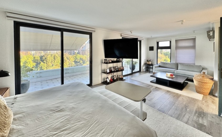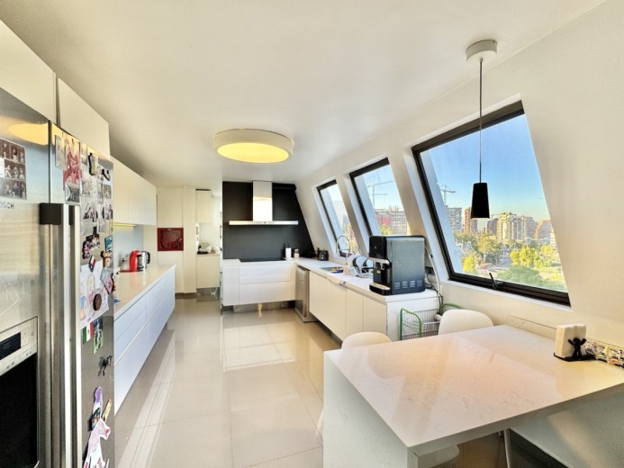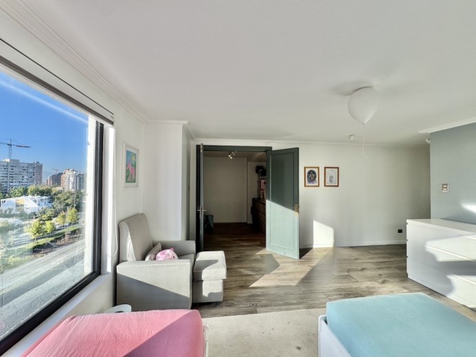 Este fabuloso y único penthouse - remodelado - impecable, luminoso y estiloso, con una ubicación privilegiada (a pasos del mall Parque Arauco, del pulmón vende Parque Araucano, de la exclusiva calle Alonso de Córdova y todo lo que esta particular calle congrega: tiendas, cafés, restaurantes y todo tipo de comercios, y con unas impresionantes vistas al club de golf Los Leones, además de vistas hacia la cordillera de Los Andes, y el cerro Manquehue), cuenta con orientación en todos los sentidos (NOSP); dos ascensores: servicios y particular; amplio y elegante hall con piso de mármol; estupendo y espacioso living comedor semi integrados, con salida a una rica terraza techada con magnifico quincho en obra y vistas panorámicas y espectaculares al club de golf; gran y luminosa cocina con comedor de diario, cubiertas en cuarzo, encimera de vitrocerámica (eléctrica), campana y hornos empotrados Bosch, área despensa y guardado, con gran logia, dormitorio y baño de servicio, además de una rica sala de estar y/o escritorio, un amplio dormitorio (o sala de juegos) con walk in closet y un baño completo, todo en el piso de acceso. El segundo piso cuenta con un enorme y estupendo dormitorio principal con estar y en suite, con acceso a una amplia terraza con maravillosas vistas al club de golf, con walk in closet con tocador y baño con vanitorio doble y shower door; con un dormitorio muy luminoso, con amplio walk in closet, gran baño y con una cómoda sala de estar. En la azotea, en el rooftop, hay un gran espacio cerrado que puede ser un dormitorio de visitas, oficina o gimnasio; y cuenta ademas con un deck con piscina, jacuzzi y mesón en obra para barbecue con vista 360° de la ciudad de Santiago. Tiene dos estacionamientos y bodega, y los pisos del departamento son en mármol, madera y porcelanato; ventanales termo panel, barandas exteriores en cristal templado; calefacción por losa radiante; equipos de aire acondicionado en todos los dormitorios y salas de estar y toldos eléctricos en terrazas.